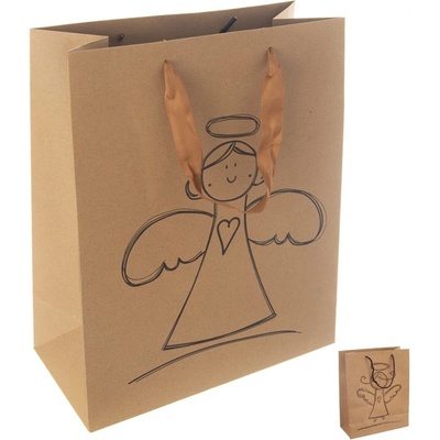 Darček pre milovanú osobu, kamarátku alebo kolegu v práci ľahko uložíte bez zložitého balenia do papierovej tašky s motívom anjela. Hodí sa pre tzv. mäkké darčeky, balenie kávy...