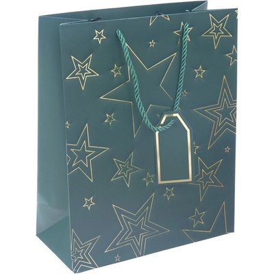 Elegantná zelená darčeková taška s dekorom zlatých hviezd je tým pravým miestom na uloženie najrôznejších darčekov, nepravidelných krabíc. Pre partnera, kamaráta, kolegu, ale aj...
